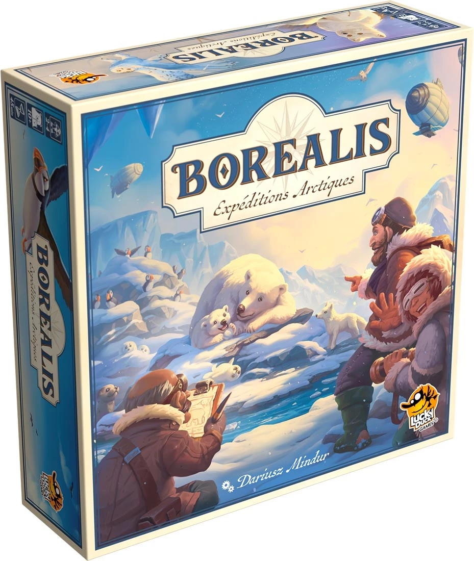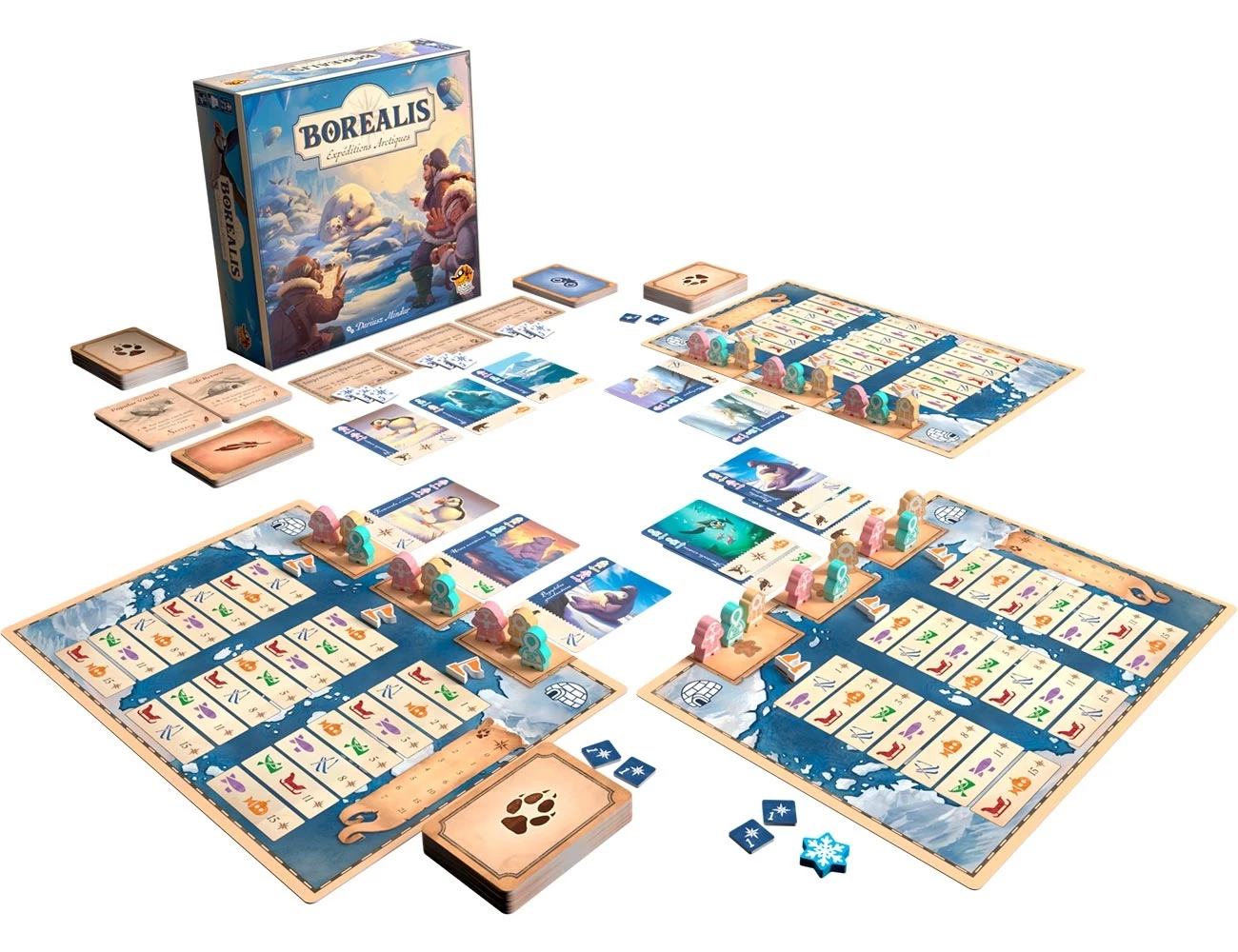 12 avril 2026Qu’on se le dise tout de suite: inutile de lever les yeux au ciel pour observer les aurores boréales. Dans Borealis, on va à peine lever les yeux de notre plateau. Ne pas quitter nos petits esquimaux des yeux, anticiper leurs déplacements, repérer les cartes qui comportent l’animal convoité et l’équipement nécéssaire pour avancer sur la piste des points. La seule interaction réside dans la course aux objectifs et la rivière qui fond comme neige au soleil. Et pourtant, le jeu nous a emballé par sa mécanique de déplacement des esquimaux et d’objectifs atrocement casse-tête. 2 actions seulement à son tour, on pourrait s’attendre à des tours très fluides… sauf si tu tombes sur un joueur qui va changer 3 fois d’avis. Borealis est un très bon casse tête, un tantinet froid au niveau des échanges avec les autres joueurs, mais très bon brise neurones.