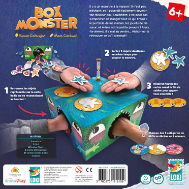 Box Monster est un jeu de reconnaissance tactile complètement frénétique dans lequel les enfants doivent se coordonner afin de réussir une succession de défis. Simultanément et en temps limité, les joueurs jouent ensemble pour retrouver les objets avalés par le monstre. Pour cela, ils utilisent uniquement leurs mains en cherchant à reconnaître au toucher les objets représentés sur chaque carte Radio. Quand 3 cartes ont été résolues, la partie est terminée.