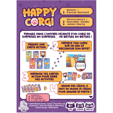 23 mars 2026Happy Corgi fonctionne très bien. C’est un jeu marrant, léger et attachant, qui assume pleinement son thème. Voir ses corgis accumuler les petites galères fait partie intégrante du plaisir de jeu tout en leur permettant de faire des activités rigolotes.