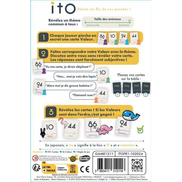22 avril 2025Je l'attendais. J'ai été déçue. Je trouve que le jeu manque cruellement de cadre. On ne sait pas trop ce qu'on a le droit de dire ou non. La communication est limitée, mais à quel point ? Dès lors que l'on a compris que notre carte était mal placée, le débat devient complètement éclaté car on argumente non pas sur notre proposition initiale mais uniquement pour placer sa carte correctement. En bref : Pourquoi jouer à Ito quand on peut jouer au merveilleux Top Ten ?