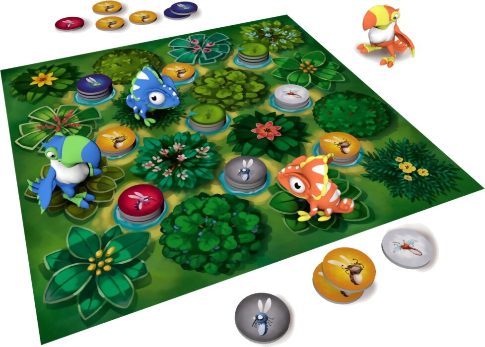 Au cours d'un tour, un joueur déplace soit son toucan, soit son caméléon. Pour déplacer le caméléon, il faut d'abord manger un des moustiques assis sur un coin de son espace actuel, puis le déplacer d'une case orthogonale. Pour déplacer le toucan, il faut le déplacer en diagonale d'une case à l'autre, en mangeant le moustique du haut que l'on dépasse. Le toucan peut se déplacer de plusieurs cases en un seul mouvement, mais il faut pouvoir manger de chaque case de coin que l'on traverse. Si vous ne pouvez pas nourrir un de vos animaux, alors vous ne pouvez pas le déplacer. Si vous ne pouvez nourrir aucun d'entre eux, vous perdez la partie.