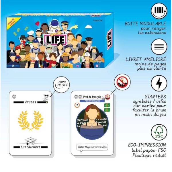 7 avril 2025C'est un jeu de cartes où le but est de réussir au maximum sa vie tout en pourrissant celles des autres. Il y a beaucoup d'interactions. Et ça on adore. Tu te la joues tranquille en faisant des études qui te permettent d'avoir un métier, ensuite de l'argent qui te permettra de voyager puis un adversaire te balance un brun out. Tu te venges en le faisant divorcer. Tu achètes ta maison grâce à l'héritage perçu ou l'argent gagné au casino. Tu as pu avoir un enfant car tu as un flirt "à risque" au camping. Le flirt dans un cinéma est moins risqué pour avoir des enfants :-) Le jeu est un peu stéréotypé mais il faut le prendre au second degré. C'est un jeu "familiale" mais pour grands enfants. Ici, on y joue à partir de 12 ans. Il y a quand même des cartes dans le jeu de base qui ne conviennent pas aux plus petits. On le recommande vivement.